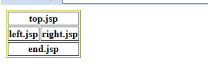 <!DOCTYPE HTML PUBLIC "-//W3C//DTD HTML 4.01 Transitional//EN"> <html> <head> </head> <body> <table border="1" bordercolor="yellow"> <tr> <th colspan="2"><%@ include file="top.jsp" %></th> </tr> <tr> <th ><%@ include file="left.jsp" %></th> <th ><%@ include file="right.jsp" %></th> </tr> <tr> <th colspan="2"><%@ include file="end.jsp" %></th> </tr> </table> </body> </html>