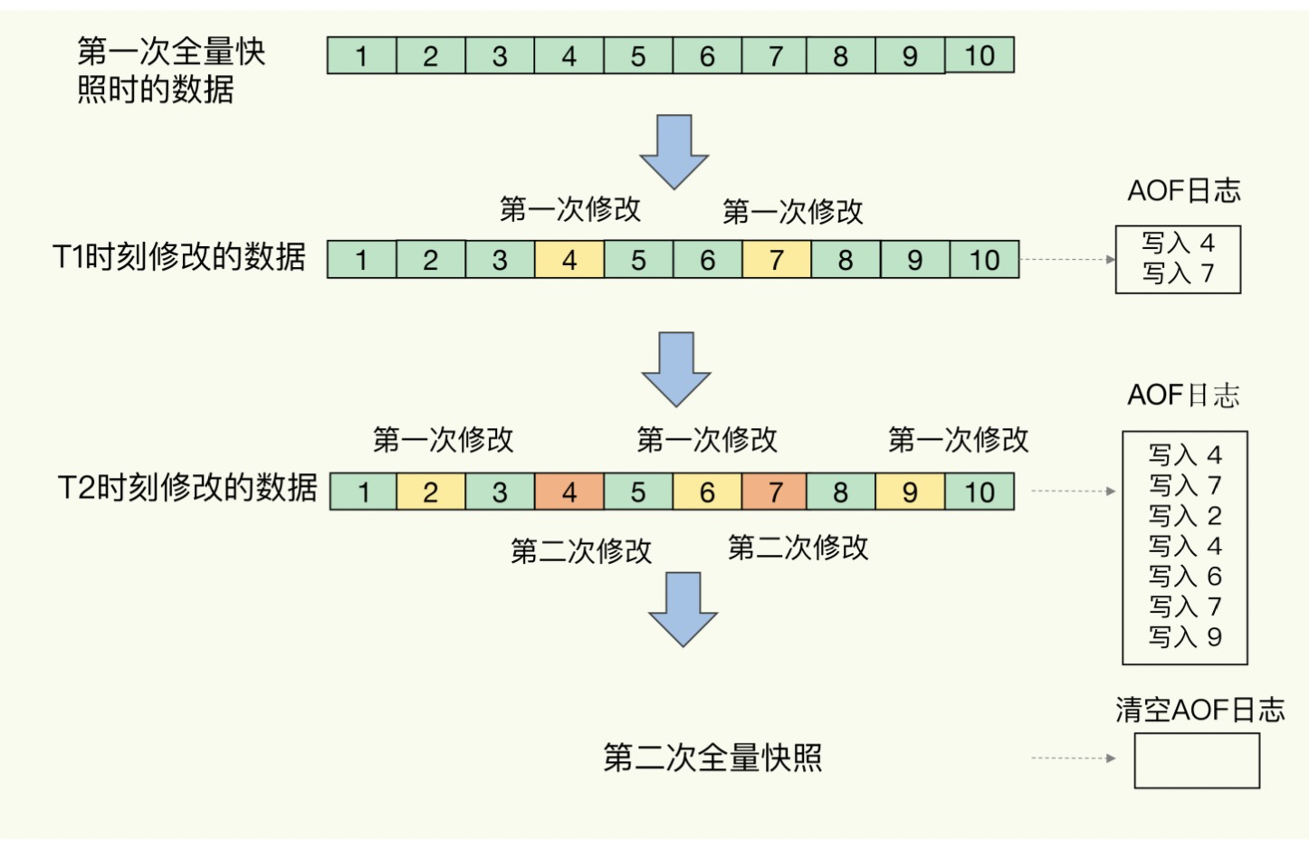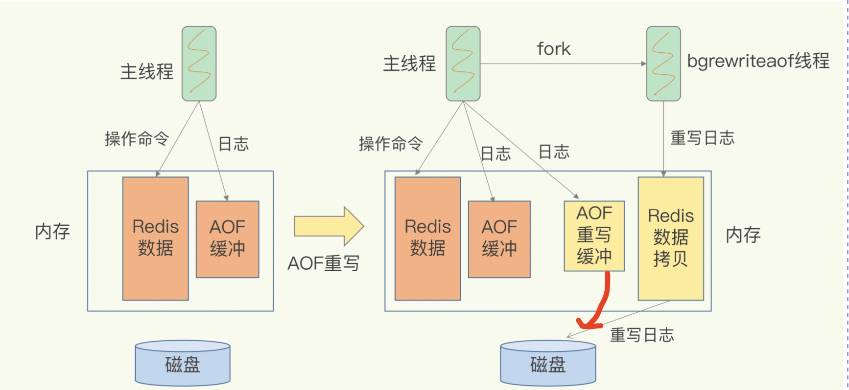 - 重写期间收到新的更新请求,先在旧AOF文件中记录,再记录在主进程的AOF重写缓冲区中,这样就避免了重写期间宕机的数据丢失
