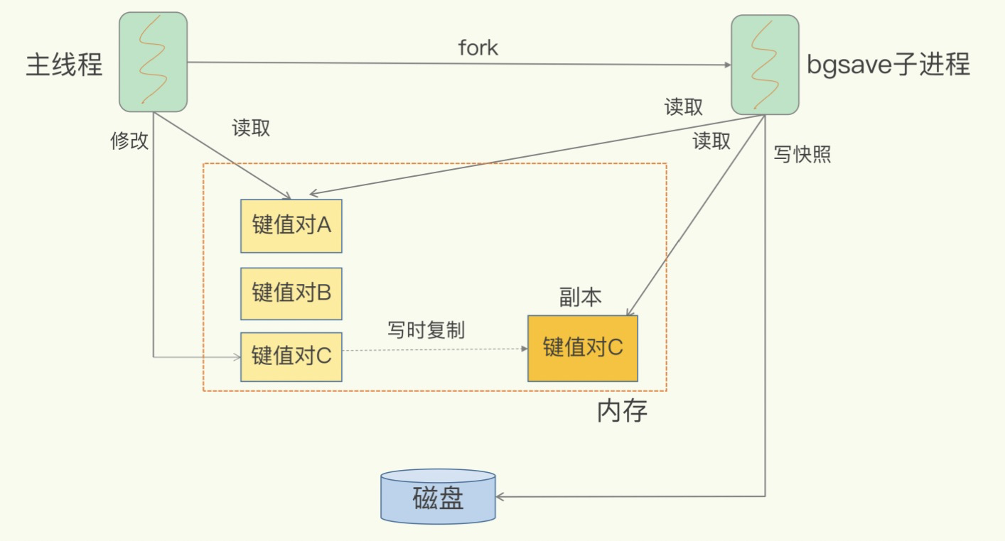 - 子进程复制了主线程的页表,所以通过页表映射,能读到主线程的原始数据,而当有新数据写入或数据修改时,主线程会把新数据或修改后的数据写到一个新的物理内存地址上,并修改主线程自己的页表映射。所以,子进程读到的类似于原始数据的一个副本,而主线程也可以正常进行修改。