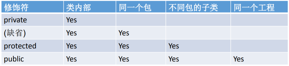 Java规定的4种权限修饰符:private、public、缺省、protected  -->封装性再细说