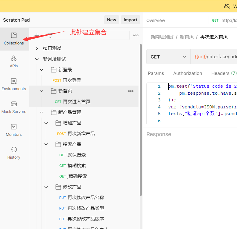 我们先在postman中新建一个集合来存储我们的测试用例,如果我们想编写一个测试用例,