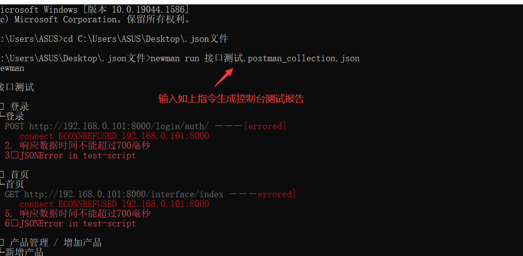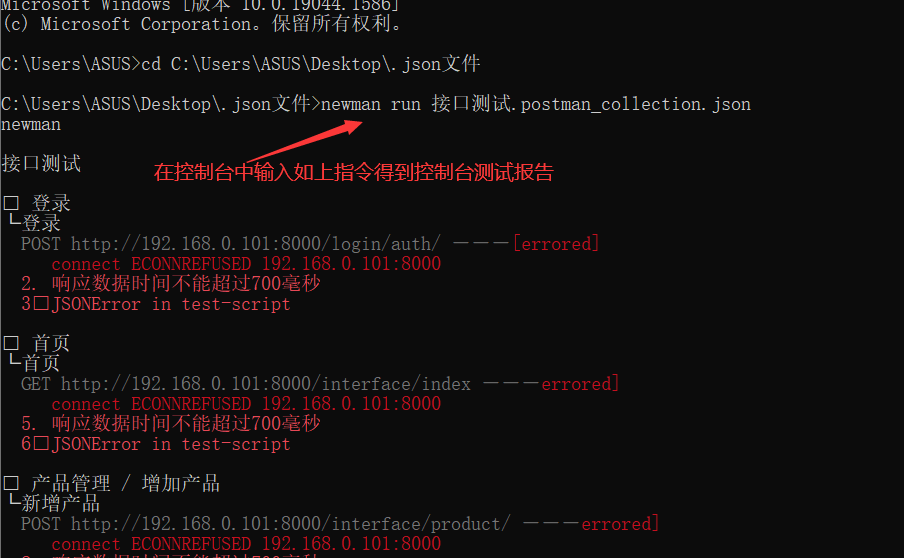 我们在控制台中输入newman run xxx.json指令就可以生成控制台测试报告,输入newman