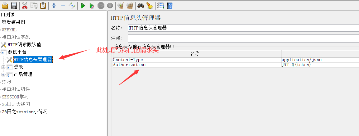我们在‘’http信息头管理器‘’中填写请求头,需要填写数据格式和访问权限;在‘’http请求默认值‘’里面我们可以将公共数据