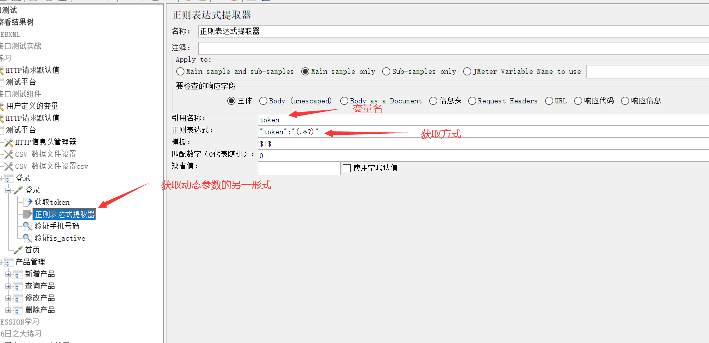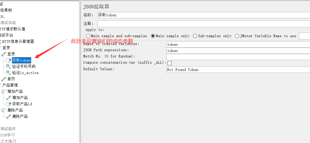 我们通过动态参数的方法,在jmeter中,我们通过创建‘’json提取器‘’来设置我们的动态参数,我们获取它的方法是${变量名};