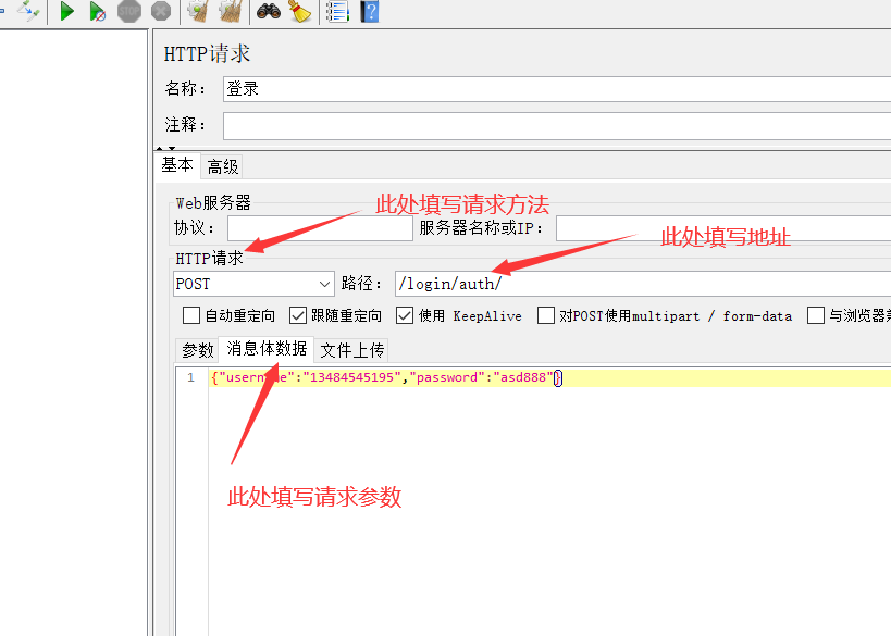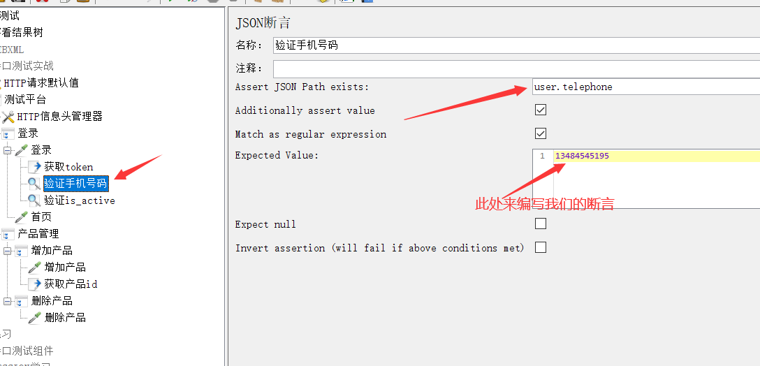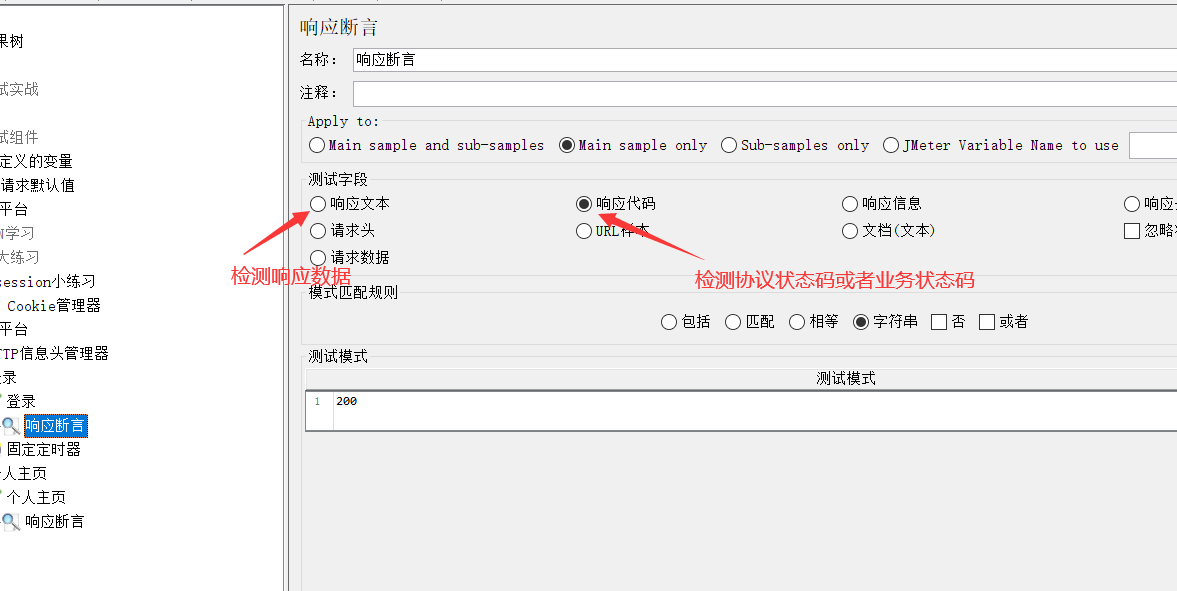 种是json断言,一种是响应断言,json断言用来验证登录的信息,响应断言用来验证响应数据,如:业务状态码、协议状态码、