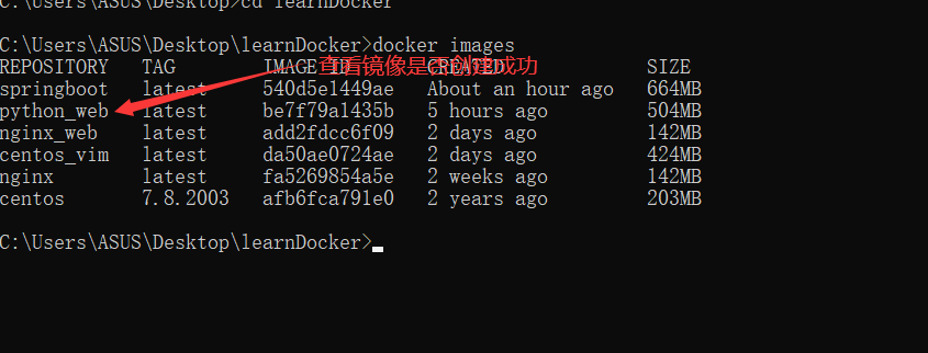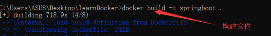 打开cmd,先到指定文件夹下,输入docker build -t 镜像名称 .即可构建成功