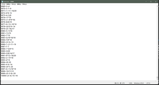 std::vector<int> EqualtionGenerator::getNums(int amount,int min,int max) { std::vector<int> nums; for (int i = 0; i < amount; ++i) { nums.push_back(rander.getRanNum(min, max)); } return nums; } std::vector<char> EqualtionGenerator::getOper(int amount) { std::vector<char> ope; char oper[4] = { '+','-','*','/' }; for (int i = 0; i < amount; ++i) { ope.push_back(oper[rander.getRanNum(0, 3)]); } return ope; } string EqualtionGenerator::getEqual(vector<int> & num, vector<char> & oper) { //position of brackets int lbrack = -1, rbrack = -1; bool flag = rander.getRanNum(0, 1) ? true : false; if (flag) { for (int i = 0; i < num.size() - 1; ++i) { if (lbrack != -1) { int isR = rander.getRanNum(lbrack + 1, num.size() - 1); rbrack = isR; break; } else { int isL = rander.getRanNum(1, num.size()) % num.size(); if (isL == 0) { lbrack = i; } } } } //generate equaltions int length = oper.size() + num.size(); string equaltion; for (int i = 0; i < length; ++i) { if (i % 2 == 0) { if (flag && lbrack == i / 2) { equaltion += '('; equaltion += to_string(num[i / 2]); } else if (flag && rbrack == i / 2) { equaltion += to_string(num[i / 2]); equaltion += ')'; } else { equaltion += to_string(num[i / 2]); } } else equaltion += oper[i / 2]; } //insert brackets //if (flag && lbrack != -1 && rbrack != -1) { // equaltion.insert(2 * lbrack, 1, '('); // if (rbrack == num.size() - 1) // equaltion.insert(2 * (rbrack+1), 1, ')'); // else // equaltion.insert(2 * (rbrack + 1), 1, ')'); //} return equaltion; }