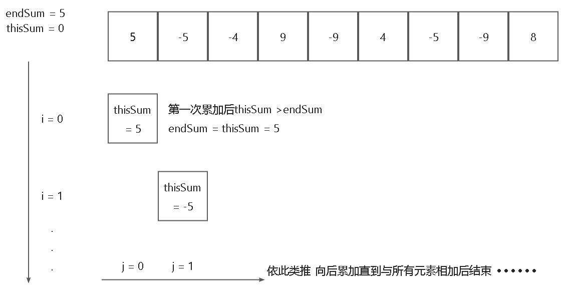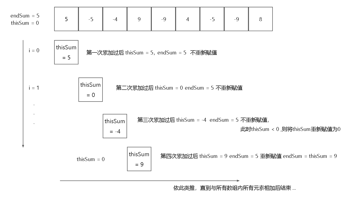 4.判断thisSum是否大于endSum,若大于则对endSum重新进行赋值操作,即endSum = thisSum;
