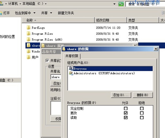 然后我们在share上单击右键,选择共享,在权限里面将everyone设置为读取单击完成总的文件夹的配置.