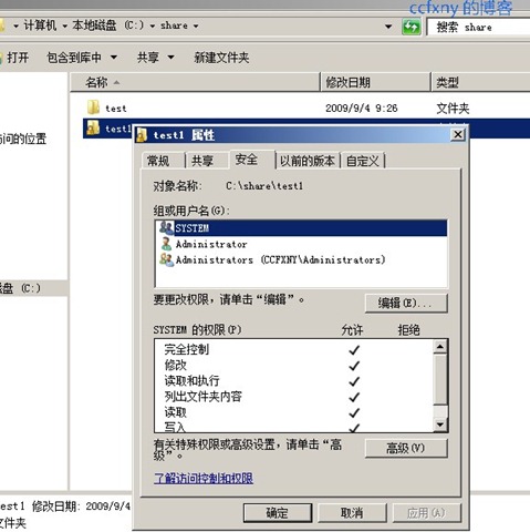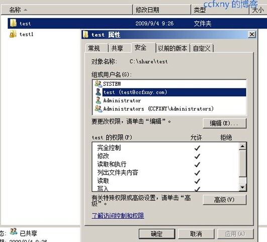 文件夹创建完毕,我们就开始配置每个部门的权限,每个部门只能看到自己的文件夹和访问.在test这个文件夹中配置安全性.将系统system和administrator管理员之外的账户删除,然后将test账户加入安全权限,完全控制.