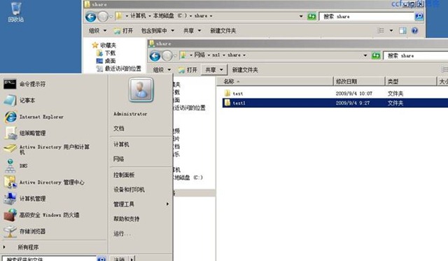 下面是在2008R2这台机器上访问\\NS1的情况,因为2008R2上登录的是管理员账户,可以看出有权限的用户能看见所有的文件夹.