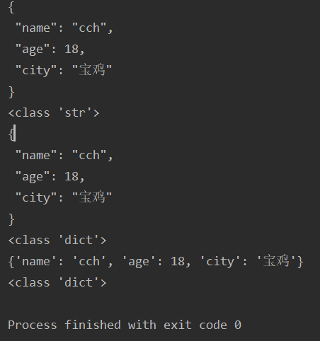 1 #字典序列化与反序列化 2 import json 3 dict1={"name":"cch","age":18,"city":"宝鸡"} 4 dict_str=json.dumps(dict1,indent=True,ensure_ascii=False) 5 print(dict_str) 6 print(type(dict_str)) 7 str_dict=json.loads(dict_str,encoding="utf-8") 8 print(dict_str) 9 print(type(str_dict)) 10 #文件序列化与反序列化 11 import json 12 dict1={"name":"cch","age":18,"city":"宝鸡"} 13 json.dump(dict1,open(file="json.txt",mode="w",encoding="utf-8"),ensure_ascii=False) #进行文件写入操作时,ensure_ascii=False可防止中文乱码 14 data=json.load(open(file="json.txt",mode="r",encoding="utf-8")) 15 print(data) 16 print(type(data))
