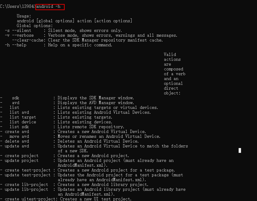 最后在控制台中输入android -h,如果如下图所示则表示sdk环境搭建成功。