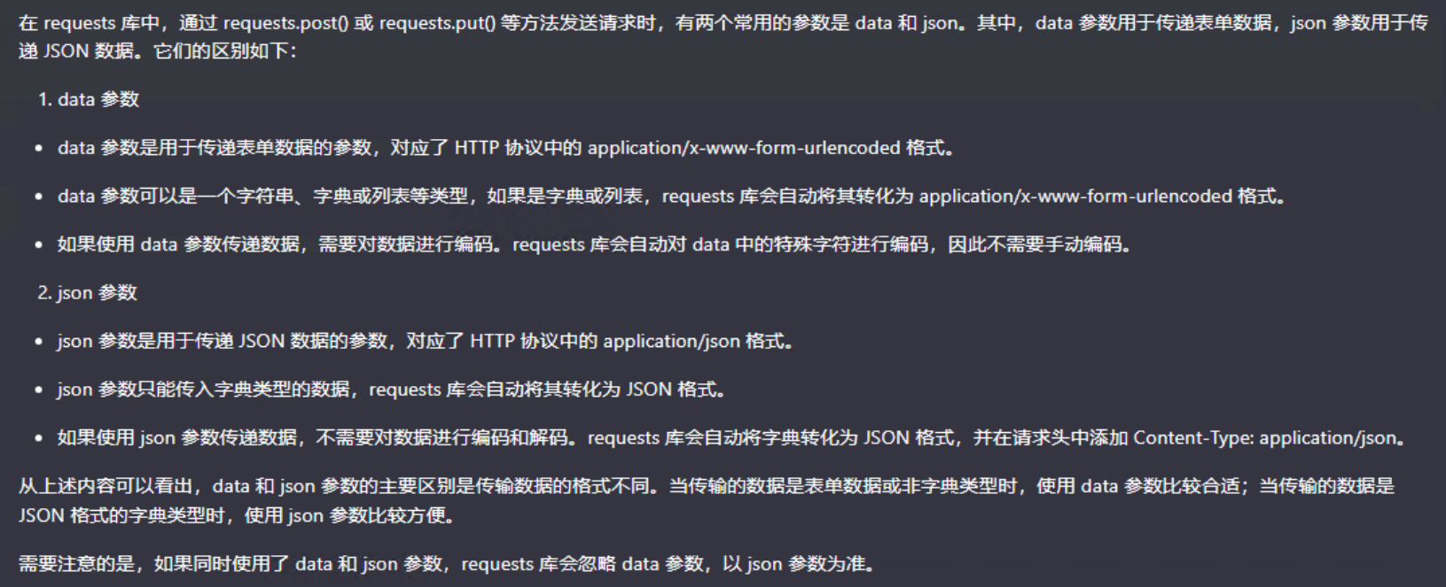 一、平时使用requests的post方法时,一般是这样写:res=requests.post(url,headers=header_data,data=body_data,verify=False), 但 看到一道题说requests中如何测试json数据的接口,看到答案是:r=requests.post(url=url,json=json)。所以想知道requests的post方法中 data参数和json 参数的区别是什么? 具体区别参考下面的解释。
