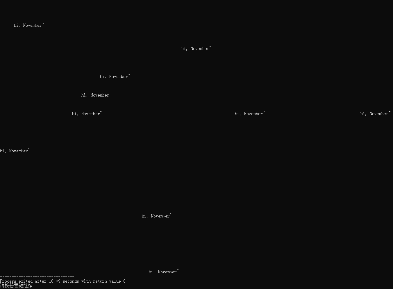1 #include <stdio.h> 2 #include <stdlib.h> 3 #include <time.h> 4 #include <windows.h> 5 #define N 80 6 void print_text(int line, int col, char text[]); // 函数声明 7 void print_spaces(int n); // 函数声明 8 void print_blank_lines(int n); // 函数声明 9 int main() { 10 int line, col, i; 11 char text[N] = "hi, November~"; 12 srand(time(0)); // 以当前系统时间作为随机种子 13 for(i = 1; i <= 10; ++i) { 14 line = rand() % 25; 15 col = rand() % 80; 16 print_text(line, col, text); 17 Sleep(1000); // 暂停1000ms 18 } 19 return 0; 20 } // 打印n个空格 21 void print_spaces(int n) { 22 int i; 23 for(i = 1; i <= n; ++i) 24 printf(" "); 25 } // 打印n行空白行 26 void print_blank_lines(int n) { 27 int i; 28 for(i = 1; i <= n; ++i) 29 printf("\n"); 30 } 31 // 在第line行第col列打印一段文本 32 void print_text(int line, int col, char text[]) { 33 print_blank_lines(line-1); // 打印(line-1)行空行 34 print_spaces(col-1); // 打印(col-1)列空格 35 printf("%s", text); // 在第line行、col列输出text中字符串 36 }