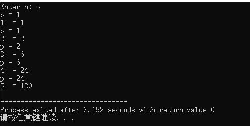 1 #include <stdio.h> 2 long long fac(int n); // 函数声明 3 int main() { 4 int i, n; 5 printf("Enter n: "); 6 scanf("%d", &n); 7 for (i = 1; i <= n; ++i) 8 printf("%d! = %lld\n", i, fac(i)); 9 return 0; 10 } // 函数定义 11 long long fac(int n) { 12 static long long p = 1; 13 printf("p = %lld\n", p); 14 p = p * n; 15 return p; 16 }