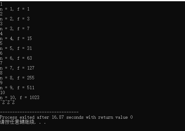 1 #include <stdio.h> 2 long long func(int n); // 函数声明 3 int main() { 4 int n; 5 long long f; 6 while (scanf("%d", &n) != EOF) { 7 f = func(n); // 函数调用 8 printf("n = %d, f = %lld\n", n, f); 9 } 10 11 return 0; 12 } 13 long long func(int n){ 14 15 long long sum=1; 16 if(n==1) 17 sum=1; 18 else 19 sum=2*func(n-1)+1; 20 21 return sum; 22 23 }
