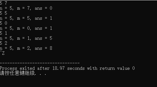 1 #include <stdio.h> 2 3 int func(int n, int m); 4 5 int main() { 6 int n, m; 7 while(scanf("%d%d", &n, &m) != EOF) 8 printf("n = %d, m = %d, ans = %d\n", n, m, func(n, m)); 9 return 0; 10 } 11 int func(int n ,int m){ 12 long long ans; 13 if(n-1==m) 14 ans=1; 15 else if(m==1) 16 ans=n; 17 else if(n<m) 18 ans=0; 19 else if(m==0) 20 ans=1; 21 else 22 ans=func(n-1,m)+func(n-1,m-1); 23 24 return ans; 25 26 27 }