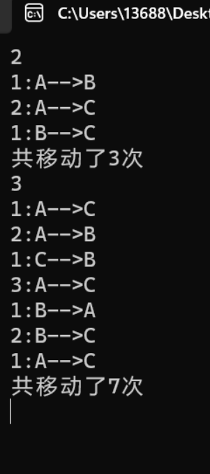 1 #define _CRT_SECURE_NO_WARNINGS 2 #include<stdio.h> 3 #include<stdlib.h> 4 void hanoi(unsigned int n, char from, char temp, char to); 5 void move(unsigned int n, char from, char to); 6 int a; 7 int main() 8 { 9 unsigned int n; 10 while (scanf("%d", &n) != EOF) 11 { 12 hanoi(n, 'A', 'B', 'C'); 13 printf("共移动了%d次\n", a); 14 a = 0; 15 } 16 return 0; 17 } 18 void hanoi(unsigned int n, char from, char temp, char to) 19 { 20 a++; 21 if (n == 1) 22 move(n, from, to); 23 else 24 { 25 26 hanoi(n - 1, from, to, temp); 27 move(n, from, to); 28 hanoi(n - 1, temp, from, to); 29 30 } 31 } 32 void move(unsigned int n, char from, char to) 33 { 34 printf("%u:%c-->%c\n", n, from, to); 35 }