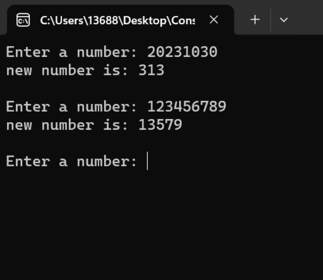 1 #define _CRT_SECURE_NO_WARNINGS 2 #include <stdio.h> 3 #include <math.h> 4 long func(long s); // 函数声明 5 int main() { 6 long s, t; 7 printf("Enter a number: "); 8 while (scanf("%ld", &s) != EOF) { 9 t = func(s); // 函数调用 10 printf("new number is: %ld\n\n", t); 11 printf("Enter a number: "); 12 } 13 return 0; 14 } 15 long func(long s) 16 { 17 int i, k, d = 1, sum = 0; 18 int a[10]; 19 int b[10]; 20 for (i = 0, k = 0; i < 10; i++) 21 { 22 a[i] = s % 10; 23 if (a[i] % 2 != 0) 24 { 25 b[k] = a[i]; 26 k++; 27 } 28 s /= 10; 29 } 30 for (i = 0; i < k; i++) 31 { 32 sum += b[i] * d; 33 d *= 10; 34 } 35 return sum; 36 }