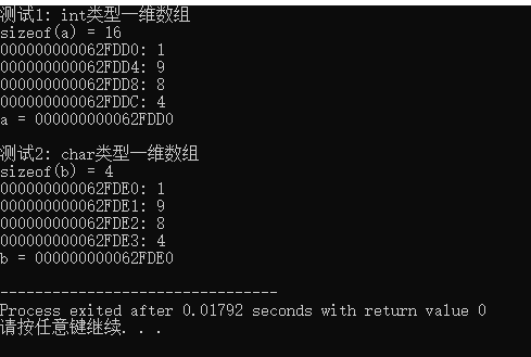 2. char型数组b,在内存中是连续存放的,每个元素占用1个内存字节单元,数组名b对应的值,和&b[0]一样