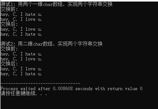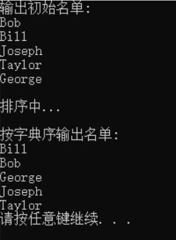 1 #include <stdio.h> 2 #include <string.h> 3 #include<stdlib.h> 4 #define N 5 5 #define M 20 6 7 // 函数声明 8 void output(char str[][M], int n); 9 void bubble_sort(char str[][M], int n); 10 11 int main() { 12 char name[][M] = {"Bob", "Bill", "Joseph", "Taylor", "George"}; 13 int i; 14 15 printf("输出初始名单:\n"); 16 output(name, N); 17 18 printf("\n排序中...\n"); 19 bubble_sort(name, N); // 函数调用 20 21 printf("\n按字典序输出名单:\n"); 22 output(name, N); 23 system("pause"); 24 return 0; 25 } 26 27 // 函数定义 28 // 功能:按行输出二维数组中的字符串 29 void output(char str[][M], int n) { 30 int i; 31 32 for(i = 0; i < n; ++i) 33 printf("%s\n", str[i]); 34 } 35 36 void bubble_sort(char str[][M], int n) 37 { 38 int i,j; 39 for(i=0;i<n-1;i++) 40 { 41 for(j=0;j<n-i-1;j++) 42 { 43 if(strcmp(str[j],str[j+1])>0) 44 { 45 char temp[][M]={0}; 46 strcpy(temp[0],str[j]); 47 strcpy(str[j],str[j+1]); 48 strcpy(str[j+1],temp[0]); 49 } 50 } 51 } 52 }