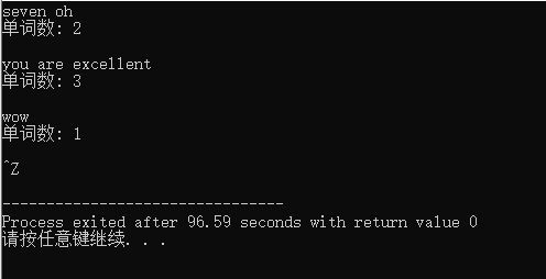 1 #include <stdio.h> 2 #define N 80 3 int count(char x[]); 4 int main() { 5 char words[N + 1]; 6 int n; 7 while (gets(words) != NULL) { 8 n = count(words); 9 printf("单词数: %d\n\n", n); 10 } 11 return 0; 12 } 13 int count(char x[]) { 14 int i; 15 int word_flag = 0; // 用作单词标志,一个新单词开始,值为1;单词结束,值为0 16 int number = 0; // 统计单词个数 17 for (i = 0; x[i] != '\0'; i++) { 18 if (x[i] == ' ') 19 word_flag = 0; 20 else if (word_flag == 0) { 21 word_flag = 1; 22 number++; 23 } 24 } 25 return number; 26 }