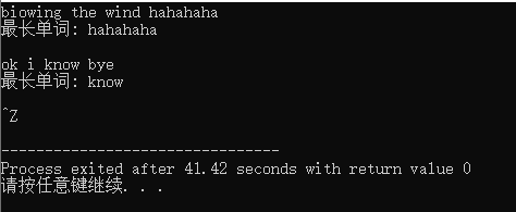 1 #include <stdio.h> 2 #define N 1000 3 int main() { 4 char line[N]; 5 int word_len; // 记录当前单词长度 6 int max_len; // 记录最长单词长度 7 int end; // 记录最长单词结束位置 8 int i; 9 while (gets(line) != NULL) { 10 word_len = 0; 11 max_len = 0; 12 end = 0; 13 i = 0; 14 while (1) { 15 // 跳过连续空格 16 while (line[i] == ' ') { 17 word_len = 0; // 单词长度置0,为新单词统计做准备 18 i++; 19 } 20 // 在一个单词中,统计当前单词长度 21 while (line[i] != '\0' && line[i] != ' ') { 22 word_len++; 23 i++; 24 } 25 // 更新更长单词长度,并,记录最长单词结束位置 26 if (max_len < word_len) { 27 max_len = word_len; 28 end = i; // end保存的是单词结束的下一个坐标位置 29 } 30 // 遍历到文本结束时,终止循环 31 if (line[i] == '\0') 32 break; 33 } 34 // 输出最长单词 35 printf("最长单词: "); 36 for (i = end - max_len; i < end; ++i) 37 printf("%c", line[i]); 38 printf("\n\n"); 39 } 40 return 0; 41 }
