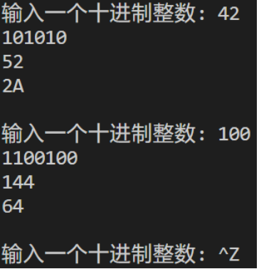 1 #include <stdio.h> 2 #include <math.h> 3 #define N 100 4 void dec_to_n(int x, int n); // 函数声明 5 int main() { 6 int x; 7 printf("输入一个十进制整数: "); 8 while (scanf("%d", &x) != EOF) { 9 dec_to_n(x, 2); // 函数调用: 把x转换成二进制输出 10 dec_to_n(x, 8); // 函数调用: 把x转换成八进制输出 11 dec_to_n(x, 16); // 函数调用: 把x转换成十六进制输出 12 printf("\n输入一个十进制整数: "); 13 } 14 return 0; 15 } 16 17 void dec_to_n(int x, int n) { 18 char s[10] = { 0 }; 19 int a[10]; 20 int cnt = 0; 21 while (x > 0) { 22 a[cnt] = x % n; 23 x /= n; 24 cnt++; 25 } 26 for (int i = 0; i < cnt; i++) { 27 s[i] = a[i] + 48; 28 if (s[i] == ':') { 29 s[i] = 'A'; 30 } 31 else if (s[i] == ';') { 32 s[i] = 'B'; 33 } 34 else if (s[i] == '<') { 35 s[i] = 'C'; 36 } 37 else if (s[i] == '=') { 38 s[i] = 'D'; 39 } 40 else if (s[i] == '>') { 41 s[i] = 'E'; 42 } 43 else if (s[i] == '?') { 44 s[i] = 'F'; 45 } 46 } 47 48 for (int cntt = cnt - 1; cntt >= 0; cntt--) { 49 printf("%c", s[cntt]); 50 } 51 printf("\n"); 52 53 }