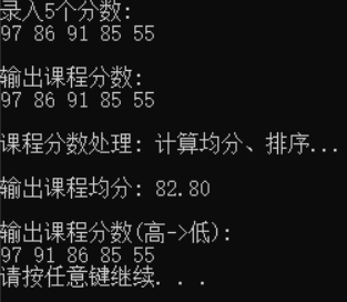 1 #include <stdio.h> 2 #include<stdlib.h> 3 #define N 5 4 5 // 函数声明 6 void input(int x[], int n); 7 void output(int x[], int n); 8 double average(int x[], int n); 9 void bubble_sort(int x[], int n); 10 11 int main() { 12 int scores[N]; 13 double ave; 14 15 printf("录入%d个分数:\n", N); 16 input(scores, N); 17 18 printf("\n输出课程分数: \n"); 19 output(scores, N); 20 21 printf("\n课程分数处理: 计算均分、排序...\n"); 22 ave = average(scores, N); 23 bubble_sort(scores, N); 24 25 printf("\n输出课程均分: %.2f\n", ave); 26 printf("\n输出课程分数(高->低):\n"); 27 output(scores, N); 28 system("pause"); 29 return 0; 30 } 31 32 // 函数定义 33 // 输入n个整数保存到整型数组x中 34 void input(int x[], int n) { 35 int i; 36 37 for(i = 0; i < n; ++i) 38 scanf("%d", &x[i]); 39 } 40 41 // 输出整型数组x中n个元素 42 void output(int x[], int n) { 43 int i; 44 45 for(i = 0; i < n; ++i) 46 printf("%d ", x[i]); 47 printf("\n"); 48 } 49 50 double average(int x[], int n) 51 { 52 int i; 53 int sum=0; 54 for(i=0;i<n;i++) 55 { 56 sum+=x[i]; 57 } 58 return sum*1.0/n; 59 } 60 61 62 63 void bubble_sort(int x[], int n) 64 { 65 int i,j; 66 for(i=0;i<n-1;i++) 67 { 68 for(j=0;j<n-i-1;j++) 69 { 70 if(x[j]<x[j+1]) 71 { 72 int temp; 73 temp=x[j]; 74 x[j]=x[j+1]; 75 x[j+1]=temp; 76 } 77 } 78 } 79 }