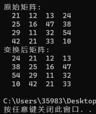 1 #define _CRT_SECURE_NO_WARNINGS 2 #include <stdio.h> 3 #define N 100 4 #define M 4 5 6 // 函数声明 7 void output(int x[][N], int n); 8 void rotate_to_right(int x[][N], int n); 9 10 11 int main() { 12 int t[][N] = { {21, 12, 13, 24}, 13 {25, 16, 47, 38}, 14 {29, 11, 32, 54}, 15 {42, 21, 33, 10} }; 16 17 printf("原始矩阵:\n"); 18 output(t, M); // 函数调用 19 20 rotate_to_right(t, M); // 函数调用 21 22 printf("变换后矩阵:\n"); 23 output(t, M); // 函数调用 24 25 return 0; 26 } 27 28 // 函数定义 29 // 功能: 输出一个n*n的矩阵x 30 void output(int x[][N], int n) { 31 int i, j; 32 33 for (i = 0; i < n; ++i) { 34 for (j = 0; j < n; ++j) 35 printf("%4d", x[i][j]); 36 37 printf("\n"); 38 } 39 } 40 41 void rotate_to_right(int x[][N], int n) 42 { 43 int temp[N]; 44 int i, j; 45 for (i = 0; i < n; i++) 46 { 47 temp[i] = x[i][n-1]; 48 } 49 for (i = n-1; i > 0 ; i--) 50 { 51 for (j =0; j < n ; j++) 52 { 53 x[j][i] = x[j][i - 1]; 54 } 55 } 56 for (i = 0; i < n; i++) 57 { 58 x[i][0] = temp[i]; 59 } 60 }