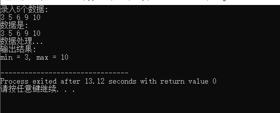 #include <stdio.h> #define N 5 void input(int x[], int n); void output(int x[], int n); void find_min_max(int x[], int n, int *pmin, int *pmax); int main() { int a[N]; int min, max; printf("录入%d个数据:\n", N); input(a, N); printf("数据是: \n"); output(a, N); printf("数据处理...\n"); find_min_max(a, N, &min, &max); printf("输出结果:\n"); printf("min = %d, max = %d\n", min, max); return 0; } void input(int x[], int n) { int i; for(i = 0; i < n; ++i) scanf("%d", &x[i]); } void output(int x[], int n) { int i; for(i = 0; i < n; ++i) printf("%d ", x[i]); printf("\n"); } void find_min_max(int x[], int n, int *pmin, int *pmax) { int i; *pmin = *pmax = x[0]; for(i = 1; i < n; ++i) if(x[i] < *pmin) *pmin = x[i]; else if(x[i] > *pmax) *pmax = x[i]; }
