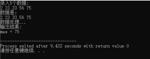1 #include <stdio.h> 2 #define N 5 3 4 void input(int x[], int n); 5 void output(int x[], int n); 6 int *find_max(int x[], int n); 7 8 int main() { 9 int a[N]; 10 int *pmax; 11 12 printf("录入%d个数据:\n", N); 13 input(a, N); 14 15 printf("数据是: \n"); 16 output(a, N); 17 18 printf("数据处理...\n"); 19 pmax = find_max(a, N); 20 21 printf("输出结果:\n"); 22 printf("max = %d\n", *pmax); 23 24 return 0; 25 } 26 27 void input(int x[], int n) { 28 int i; 29 30 for(i = 0; i < n; ++i) 31 scanf("%d", &x[i]); 32 } 33 34 void output(int x[], int n) { 35 int i; 36 37 for(i = 0; i < n; ++i) 38 printf("%d ", x[i]); 39 printf("\n"); 40 } 41 42 int *find_max(int x[], int n) { 43 int max_index = 0; 44 int i; 45 46 for(i = 1; i < n; ++i) 47 if(x[i] > x[max_index]) 48 max_index = i; 49 50 return &x[max_index]; 51 }