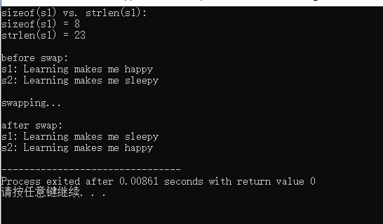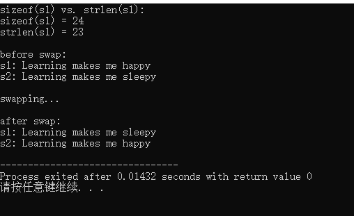 1 #include <stdio.h> 2 #include <string.h> 3 #define N 80 4 5 int main() { 6 char s1[] = "Learning makes me happy"; 7 char s2[] = "Learning makes me sleepy"; 8 char tmp[N]; 9 10 printf("sizeof(s1) vs. strlen(s1): \n"); 11 printf("sizeof(s1) = %d\n", sizeof(s1)); 12 printf("strlen(s1) = %d\n", strlen(s1)); 13 14 printf("\nbefore swap: \n"); 15 printf("s1: %s\n", s1); 16 printf("s2: %s\n", s2); 17 18 printf("\nswapping...\n"); 19 strcpy(tmp, s1); 20 strcpy(s1, s2); 21 strcpy(s2, tmp); 22 23 printf("\nafter swap: \n"); 24 printf("s1: %s\n", s1); 25 printf("s2: %s\n", s2); 26 27 return 0; 28 }