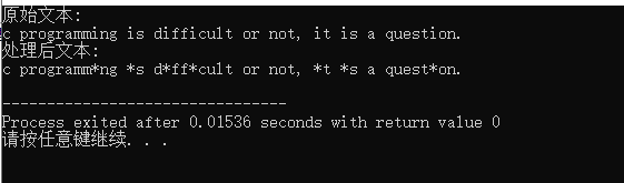 1 #include <stdio.h> 2 #define N 80 3 4 void replace(char *str, char old_char, char new_char); // 函数声明 5 6 int main() { 7 char text[N] = "c programming is difficult or not, it is a question."; 8 9 printf("原始文本: \n"); 10 printf("%s\n", text); 11 12 replace(text, 'i', '*'); // 函数调用 注意字符形参写法,单引号不能少 13 14 printf("处理后文本: \n"); 15 printf("%s\n", text); 16 17 return 0; 18 } 19 20 // 函数定义 21 void replace(char *str, char old_char, char new_char) { 22 int i; 23 24 while(*str) { 25 if(*str == old_char) 26 *str = new_char; 27 str++; 28 } 29 }