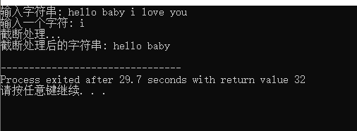1 #include <stdio.h> 2 #define N 80 3 4 void str_trunc(char *str, char x); 5 6 int main() { 7 char str[N]; 8 char ch; 9 10 printf("输入字符串: "); 11 gets(str); 12 13 printf("输入一个字符: "); 14 ch = getchar(); 15 16 printf("截断处理...\n"); 17 str_trunc(str, ch); 18 19 printf("截断处理后的字符串: %s\n", str); 20 21 } 22 23 void str_trunc(char *str, char x) { 24 while(*str) { 25 if(*str == x) 26 *str='\0' ; // blank1 27 28 str++; // blank2 29 } 30 31 return 0; // blank3 32 }