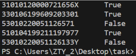 1 #include <stdio.h> 2 #include <string.h> 3 #define N 5 4 int check_id(char* str); // 函数声明 5 int main() 6 { 7 char* pid[N] = { 8 "31010120000721656X", 9 "330106199609203301", 10 "53010220051126571", 11 "510104199211197977", 12 "53010220051126133Y" }; 13 int i; 14 for (i = 0; i < N; ++i) 15 if (check_id(pid[i])) // 函数调用 16 printf("%s\tTrue\n", pid[i]); 17 else 18 printf("%s\tFalse\n", pid[i]); 19 return 0; 20 } 21 // 函数定义 22 // 功能: 检查指针str指向的身份证号码串形式上是否合法。 23 // 形式合法,返回1,否则,返回0 24 int check_id(char* str) { 25 int judge = 1; 26 int i; 27 for (i = 0; i < 18; i++) { 28 if (strlen(str) != 18) { 29 judge = 0; 30 break; 31 } 32 if (*(str + i) < 48 || *(str + i) > 57) { 33 if (*(str + i) != 'X') { 34 judge = 0; 35 break; 36 } 37 } 38 } 39 40 return judge; 41 }