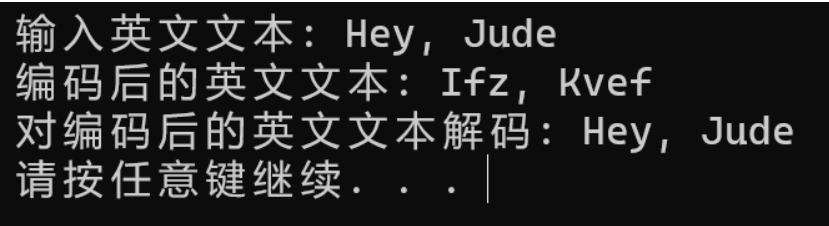 1 #include<stdio.h> 2 #include<stdlib.h> 3 #define N 80 4 void encoder(char *str); // 函数声明 5 void decoder(char *str); // 函数声明 6 7 int main() { 8 char words[N]; 9 10 printf("输入英文文本: "); 11 gets(words); 12 13 printf("编码后的英文文本: "); 14 encoder(words); // 函数调用 15 printf("%s\n", words); 16 17 printf("对编码后的英文文本解码: "); 18 decoder(words); // 函数调用 19 printf("%s\n", words); 20 system("pause"); 21 return 0; 22 } 23 24 /*函数定义 25 功能:对s指向的字符串进行编码处理 26 编码规则: 27 对于a~z或A~Z之间的字母字符,用其后的字符替换; 其中,z用a替换,Z用A替换 28 其它非字母字符,保持不变 29 */ 30 void encoder(char *str) 31 { 32 while(*str) 33 { 34 if(*str=='z'||*str=='Z') 35 { 36 *str=*str-26; 37 } 38 if((*str<'z'&&*str>='a')||(*str<'Z'&&*str>='A')) 39 *str=*str+1; 40 str++; 41 } 42 } 43 44 /*函数定义 45 功能:对s指向的字符串进行解码处理 46 解码规则: 47 对于a~z或A~Z之间的字母字符,用其前面的字符替换; 其中,a用z替换,A用Z替换 48 其它非字母字符,保持不变 49 */ 50 void decoder(char *str) 51 { 52 while(*str) 53 { 54 if(*str=='a'||*str=='A') 55 { 56 *str=*str+26; 57 } 58 if((*str>'a'&&*str<='z')||(*str>'A'&&*str<='Z')) 59 *str=*str-1; 60 str++; 61 } 62 }