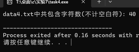 1 #include <stdio.h> 2 #include <ctype.h> 3 4 int main() { 5 FILE *file; 6 int count = 0; 7 int ch; 8 9 file = fopen("data4.txt", "r"); 10 if (file == NULL) { 11 printf("Could not open file.\n"); 12 return 1; 13 } 14 15 while ((ch = fgetc(file)) != EOF) { 16 if (!isspace(ch)) { 17 ++count; 18 } 19 } 20 21 fclose(file); 22 printf("data4.txt中共包含字符数(不计空白符): %d\n", count); 23 return 0; 24 }