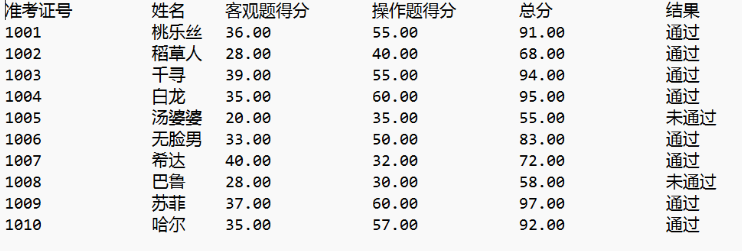 1 #include <stdio.h> 2 #include <string.h> 3 #include <stdlib.h> 4 5 #define N 10 6 7 typedef struct { 8 long int id; 9 char name[20]; 10 float objective; // 客观题得分 11 float subjective; // 操作题得分 12 float sum; // 总分 13 char ans[10]; // 考试结果 14 } STU; 15 16 // 函数声明 17 void finput(STU st[], int n); 18 void foutput(STU st[], int n); 19 void output(STU st[], int n); 20 int process(STU st[], int n, STU st_pass[]); 21 22 int main() { 23 STU stu[N], stu_pass[N]; 24 int cnt; 25 double pass_rate; 26 27 printf("从文件读入%d个考生信息...\n", N); 28 finput(stu, N); 29 30 printf("\n对考生成绩进行统计...\n"); 31 cnt = process(stu, N, stu_pass); 32 33 printf("\n通过考试的名单:\n"); 34 output(stu,N); // 输出到屏幕 35 foutput(stu, N); // 输出到文件 36 37 pass_rate = 1.0 * cnt / N; 38 printf("\n本次等级考试通过率: %.2f%%\n", pass_rate*100); 39 40 return 0; 41 } 42 43 // 把通过考试的考生完整信息输出到屏幕上 44 // 准考证号,姓名,客观题得分,操作题得分,总分,结果 45 void output(STU st[], int n) { 46 int i; 47 48 printf("准考证号\t姓名\t客观题得分\t操作题得分\t总分\t\t结果\n"); 49 for (i = 0; i < n; i++) 50 printf("%ld\t\t%s\t%.2f\t\t%.2f\t\t%.2f\t\t%s\n", st[i].id, st[i].name, st[i].objective, st[i].subjective, st[i].sum, st[i].ans); 51 } 52 53 // 从文本文件examinee.txt读入考生信息:准考证号,姓名,客观题得分,操作题得分 54 void finput(STU st[], int n) { 55 int i; 56 FILE *fin; 57 58 fin = fopen("examinee.txt", "r"); 59 if (fin == NULL) { 60 printf("fail to open file\n"); 61 exit(0); 62 } 63 64 while (!feof(fin)) { 65 for (i = 0; i < n; i++) 66 fscanf(fin, "%ld %s %f %f", &st[i].id, st[i].name, &st[i].objective, &st[i].subjective); 67 } 68 69 fclose(fin); 70 } 71 72 // 把通过考试的考生完整信息写入文件list_pass.txt 73 // 准考证号,姓名,客观题得分,操作题得分,总分,结果 74 void foutput(STU s[], int n) { 75 FILE *fout; 76 int i; 77 78 // 保存到文件 79 fout = fopen("list_pass.txt", "w"); 80 if (!fout) { 81 printf("fail to open or create list_pass.txt\n"); 82 exit(0); 83 } 84 85 fprintf(fout, "准考证号\t\t姓名\t客观题得分\t操作题得分\t总分\t\t结果\n"); 86 87 for (i = 0; i < n; i++) 88 fprintf(fout, "%ld\t\t%s\t%.2f\t\t%.2f\t\t%.2f\t\t%s\n", s[i].id, s[i].name, s[i].objective, s[i].subjective, s[i].sum, s[i].ans); 89 90 fclose(fout); 91 } 92 93 94 95 // 对考生信息进行处理:计算每位考生考试总分、结果;统计考试通过的人数 96 int process(STU st[], int n, STU st_pass[]) { 97 int i,t = 0; 98 for(i = 0; i < n; i++){ 99 st[i].sum = st[i].objective + st[i].subjective; 100 if(st[i].sum >= 60){ 101 st_pass[t++] = st[i]; 102 strcpy(st[i].ans,"pass"); 103 } 104 else 105 strcpy(st[i].ans,"fail"); 106 } 107 108 return t; 109 }