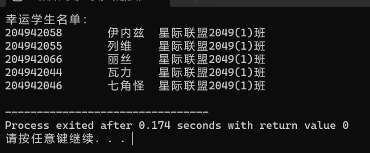 1 #include <stdio.h> 2 #include <stdlib.h> 3 #include <string.h> 4 #include <time.h> 5 6 #define MAX_STUDENTS 80 7 #define LUCKY_COUNT 5 8 9 // 读取学生名单 10 void readStudents(char students[MAX_STUDENTS][50], int *count) { 11 FILE *file = fopen("list.txt", "r"); 12 if (!file) { 13 printf("无法打开文件 list.txt\n"); 14 exit(1); 15 } 16 17 while (!feof(file) && *count < MAX_STUDENTS) { 18 fgets(students[*count], 50, file); 19 // 去除换行符 20 students[*count][strcspn(students[*count], "\n")] = 0; 21 (*count)++; 22 } 23 24 fclose(file); 25 } 26 27 // 随机抽取学生并写入文件 28 void pickLuckyStudents(char students[MAX_STUDENTS][50], int count) { 29 FILE *file = fopen("lucky.txt", "w"); 30 if (!file) { 31 printf("无法创建文件 lucky.txt\n"); 32 exit(1); 33 } 34 35 printf("幸运学生名单:\n"); 36 for (int i = 0; i < LUCKY_COUNT; i++) { 37 int randomIndex = rand() % count; 38 printf("%s\n", students[randomIndex]); 39 fprintf(file, "%s\n", students[randomIndex]); 40 } 41 42 fclose(file); 43 } 44 45 int main() { 46 char students[MAX_STUDENTS][50]; 47 int count = 0; 48 49 srand((unsigned int)time(NULL)); // 初始化随机数发生器 50 readStudents(students, &count); 51 pickLuckyStudents(students, count); 52 53 return 0; 54 }