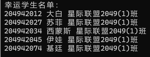 1 #include <stdio.h> 2 #include <stdlib.h> 3 #include <string.h> 4 #include <time.h> 5 6 #define MAX_STUDENTS 80 7 #define LUCKY_COUNT 5 8 9 typedef struct { 10 long id; // 学号 11 char name[50]; // 姓名 12 char class[50]; // 班级 13 } Student; 14 15 // 读取学生名单 16 int readStudents(Student students[MAX_STUDENTS]) { 17 FILE *file = fopen("list.txt", "r"); 18 int count = 0; 19 if (!file) { 20 printf("无法打开文件 list.txt\n"); 21 exit(1); 22 } 23 24 while (fscanf(file, "%ld %s %[^\n]", &students[count].id, students[count].name, students[count].class) != EOF && count < MAX_STUDENTS) { 25 count++; 26 } 27 28 fclose(file); 29 return count; 30 } 31 32 // 比较两个学生(用于排序) 33 int compareStudents(const void *s1, const void *s2) { 34 Student *student1 = (Student *)s1; 35 Student *student2 = (Student *)s2; 36 return (int)(student1->id - student2->id); 37 } 38 39 // 随机抽取学生并写入文件 40 void pickLuckyStudents(Student students[MAX_STUDENTS], int count) { 41 Student luckyStudents[LUCKY_COUNT]; 42 int chosenIndices[MAX_STUDENTS] = {0}; 43 int i; 44 for (i = 0; i < LUCKY_COUNT; i++) { 45 int randomIndex; 46 do { 47 randomIndex = rand() % count; 48 } while (chosenIndices[randomIndex]); 49 50 chosenIndices[randomIndex] = 1; 51 luckyStudents[i] = students[randomIndex]; 52 } 53 54 // 按学号排序 55 qsort(luckyStudents, LUCKY_COUNT, sizeof(Student), compareStudents); 56 57 // 获取当前日期 58 char fileName[20]; 59 time_t now = time(NULL); 60 struct tm *t = localtime(&now); 61 sprintf(fileName, "%04d%02d%02d.txt", t->tm_year + 1900, t->tm_mon + 1, t->tm_mday); 62 63 FILE *file = fopen(fileName, "w"); 64 if (!file) { 65 printf("无法创建文件 %s\n", fileName); 66 exit(1); 67 } 68 69 printf("幸运学生名单:\n"); 70 for ( i = 0; i < LUCKY_COUNT; i++) { 71 printf("%ld %s %s\n", luckyStudents[i].id, luckyStudents[i].name, luckyStudents[i].class); 72 fprintf(file, "%ld %s %s\n", luckyStudents[i].id, luckyStudents[i].name, luckyStudents[i].class); 73 } 74 75 fclose(file); 76 } 77 78 int main() { 79 Student students[MAX_STUDENTS]; 80 srand((unsigned int)time(NULL)); // 初始化随机数发生器 81 82 int count = readStudents(students); 83 if (count > 0) { 84 pickLuckyStudents(students, count); 85 } else { 86 printf("未读取到任何学生信息。\n"); 87 } 88 89 return 0; 90 }