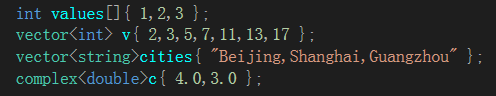 例1:例如:vector<string>cities{ "Beijing,Shanghai,Guangzhou" };这形成一个initializer_list<string>,背后有一个array<string,6>,调用vector<string>ctors时,编译器找到了一个vector<string>ctor接受initializer_list<string>,刚好作为一个包传入,所有容器都有这样的ctor.