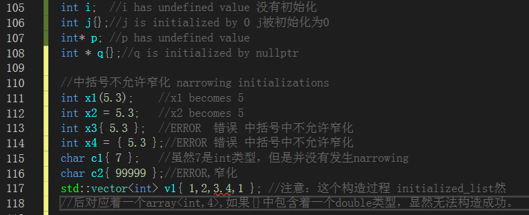 C++11提供了一个一致性初始化方法(Uniform Initialization),它使用大括号(braces).