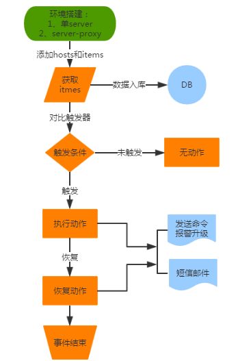 环境安装->添加hosts/items/模板->获取items->入库、存档->对比触发器阈值->触发报警->执行动作->建立事件-->触发器阈值恢复正常->告警恢复->恢复动作-->事件结束