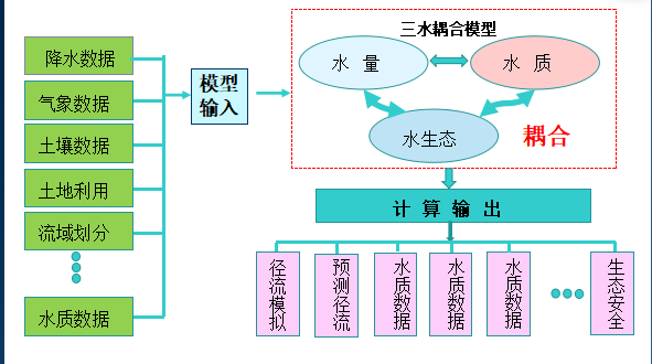在流域尺度上,进行包括大气过程、地表过程、河道过程及地下过程构成的水循环过程的水量模拟预测。