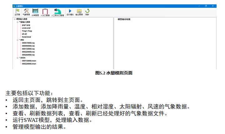 水量模拟预测:输入降水数据、气象数据、土壤数据、土地利用数据等信息后,在流域尺度上,进行包括大气过程、地表过程、河道过程及地下过程构成的水循环过程的模拟预测,得到流域的径流模拟数据和预测径流数据。