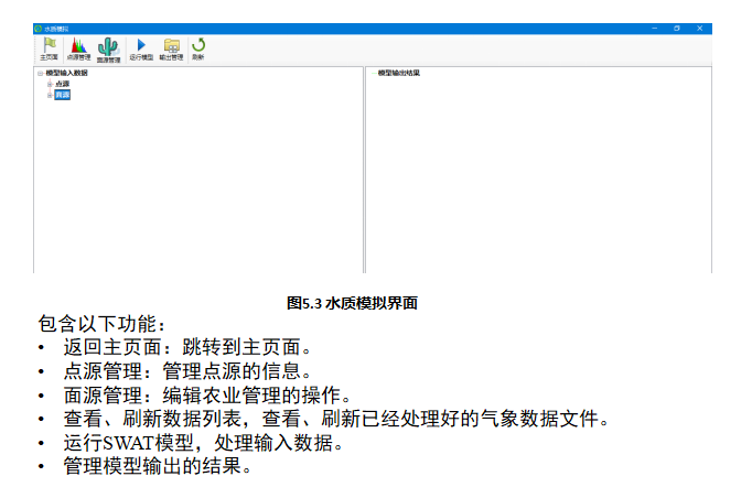 水质模拟预测:输入点源水质、施肥、农药、灌溉种类等信息后,进行包括污染物产生、入河、在河道及地下环境中的迁移转化过程的水质模拟预测。