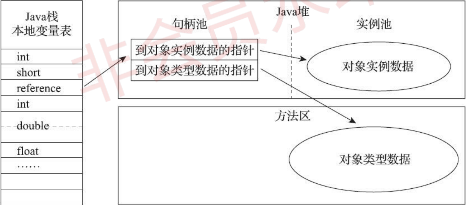 句柄访问:Java堆中将可能会划分出一块内存来作为句柄池,reference中存储的就是对象的句柄地址,而句柄中包含了对象实例数据与类型数据各自具体的地址信息 ↩︎
