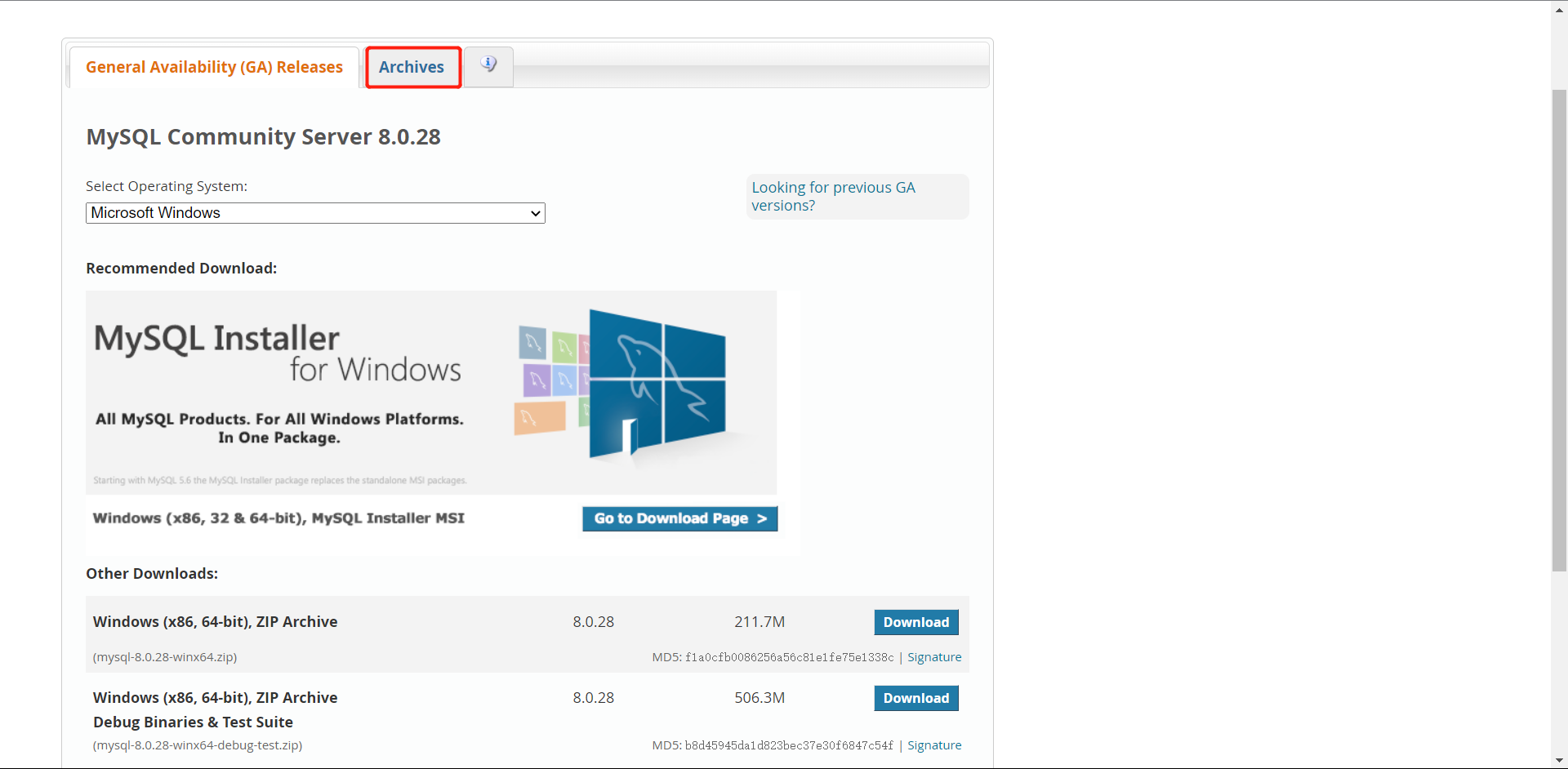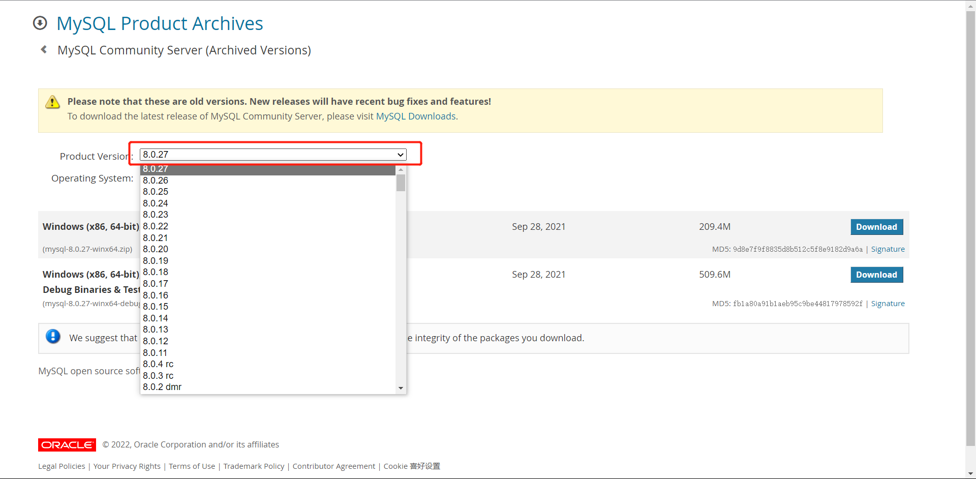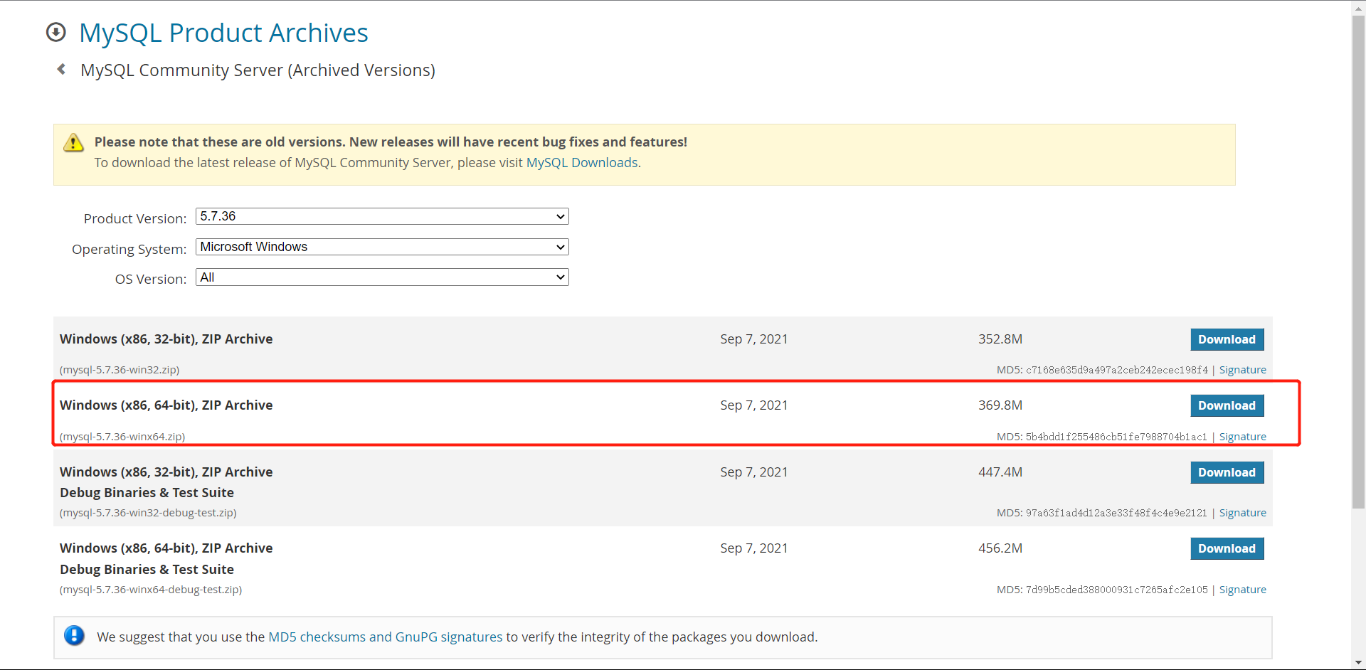 (在此可以选择MySQL的安装版本,在此我们下载的是5.7.36)